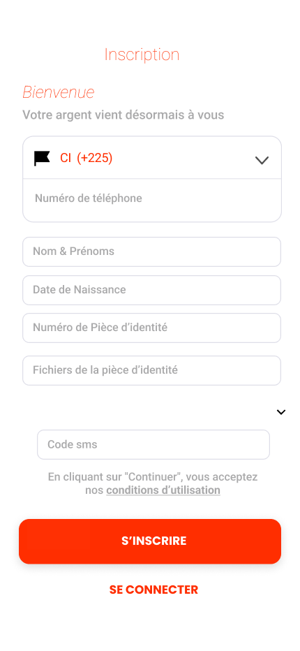 Un code de confirmation est envoyé par SMS afin de vérifier le numéro de téléphone. Le code reçu est saisi dans le champ prévu à cet effet pour finaliser l’inscription.